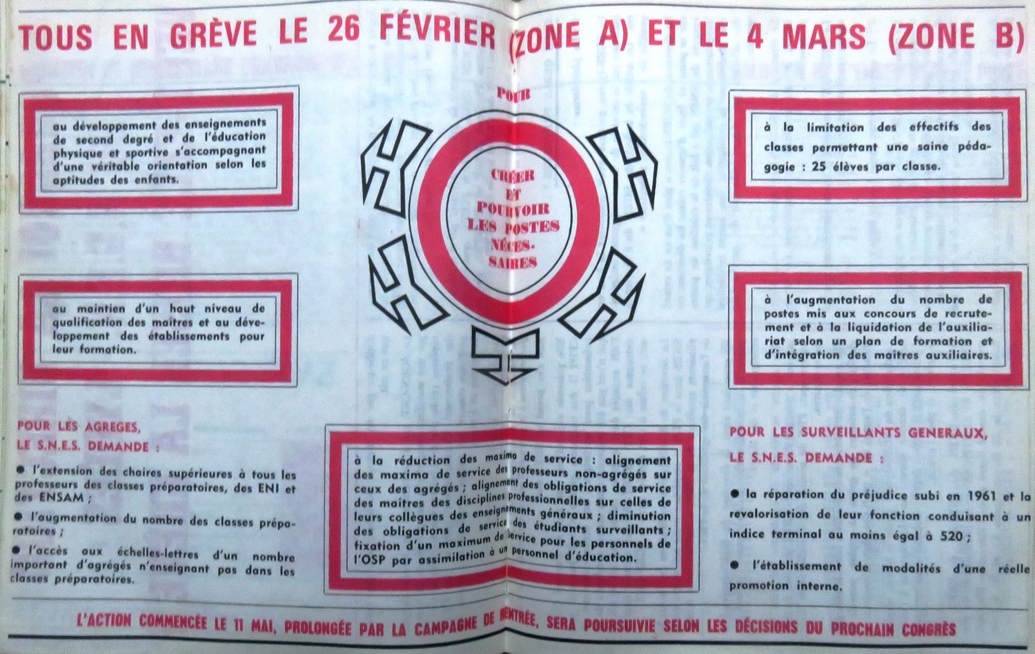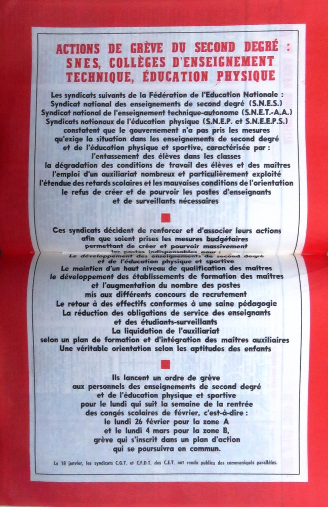 Un accord s’est réalisé le 18 janvier 1968 entre les quatre principaux syndicats du second degré de la FEN pour organiser l’action (SNES, SNETAA, SNEP et SNEEPS). Le SNETP-CGT et le SGEN des collèges technique appellent également à la grève. Seul le SGEN lycées reste en dehors du mouvement.