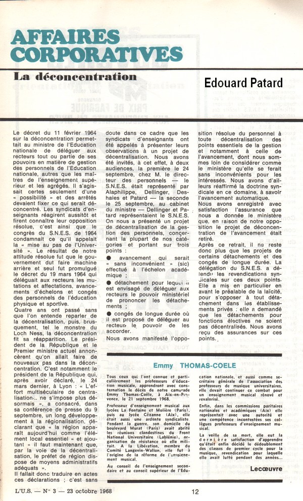 La déconcentration fragmentaire de la gestion des personnels avait commencé en 1964. Nouvelle alerte après le mouvement de Mai-Juin 1968, sur laquelle Edouard Patard fait le point dans L’US du 23 octobre 1968.
