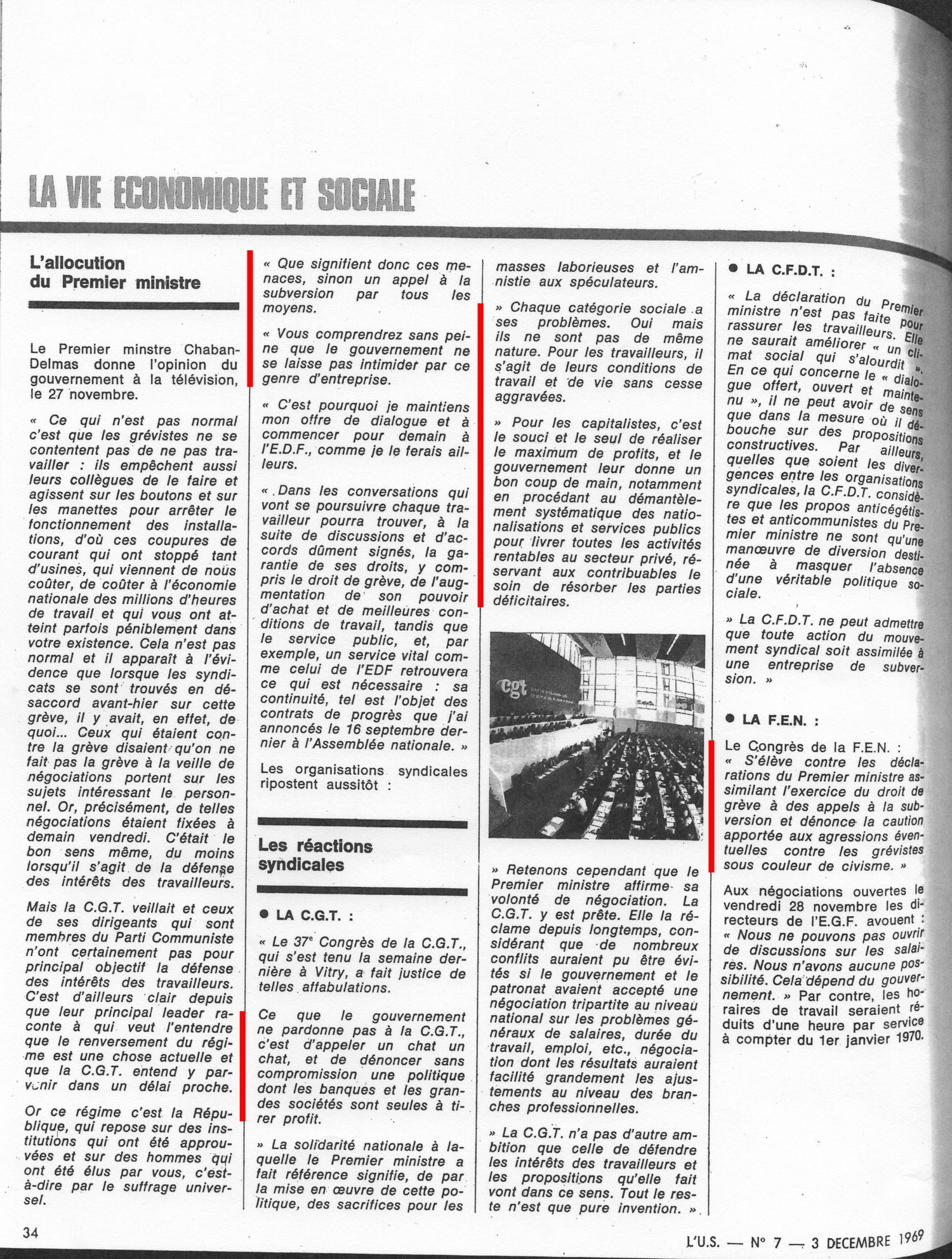 Il y a 50 ans jours pour jour, le Premier ministre, Jacques Chaban-Delmas, l’inventeur du projet de "Nouvelle société" qui prétendait "débloquer" la société française, qualifiait la grève à l’EDF d’appel à la subversion... Suscitant la réplique de la CGT, de la CFDT et de la FEN.
