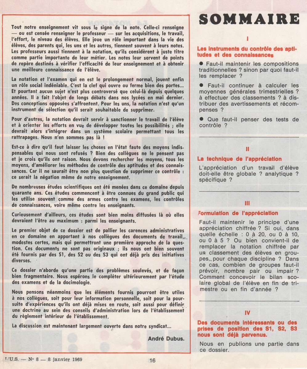En 1969, le ministre tenta de mettre fin, par une circulaire du 6 janvier, à la fois aux classements, aux compositions et aux notes sur 20. On a surtout retenu leur remplacement par des lettres (A, B, C, D, E) bien que le ministre en explicite la signification : « très satisfaisant, satisfaisant, moyen, insuffisant, très insuffisant ». La question fit débat dans les salles des profs, ainsi qu’à l’intérieur du SNES, y compris dans la tendance majoritaire Unité et Action.