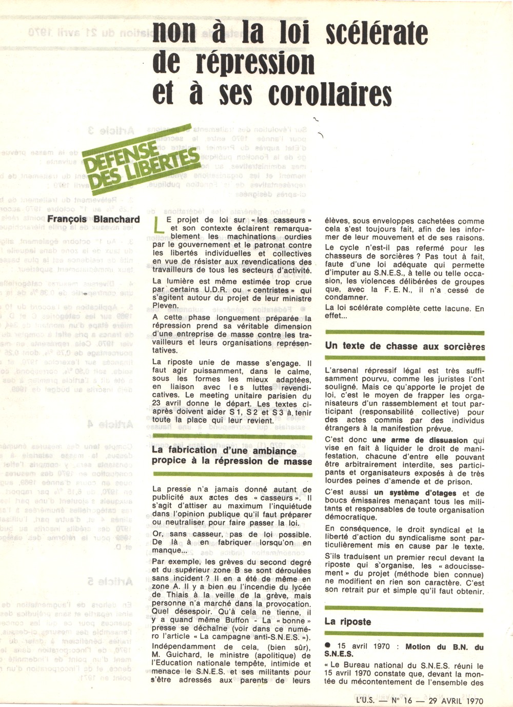 Le syndicat n’approuve pas l’action violente, il la combat même souvent. Mais il est très pointilleux quant à la défense des droits des militants, même « gauchistes ». Dans le même numéro, il apporte ainsi son soutien public à Jean-Pierre Le Dantec, alors enseignant à Créteil, arrêté quelques jours plus tôt en sa qualité de directeur du journal maoïste « La Cause du Peuple ».
