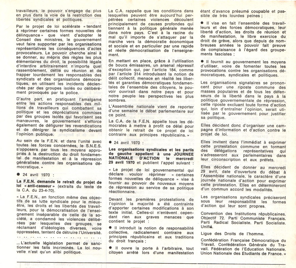 Au printemps 1970, René Pleven, le Garde des sceaux « centriste », présente un projet de loi « tendant à réprimer certaines formes nouvelles de délinquance », qui passera à la postérité sous le nom de « loi anticasseurs ». Débattue dès la fin avril au Parlement, elle est définitivement adoptée début juin, et suscite la réprobation et la mobilisation de la gauche, notamment syndicale.