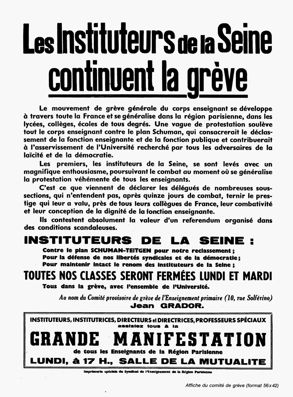 C’est dans ce contexte, qu’à la suite d’une consultation à la base, est déclenchée la grève des instituteurs de la Seine, plus durement touchés que leurs collègues par la hausse du coût de la vie et le petit nombre de logements de fonction. C’est la première grève enseignante, massive, qui va durer trois semaines. Lors du CN du SNI (Syndicat national des instituteurs) du 22 novembre, les majoritaires adoptent la motion Denis Forestier, désavouant la grève et « conseillant à la section de la Seine d’interrompre momentanément son mouvement d’action directe ». Le syndicat de la région parisienne de la FEN (SERP) dirigé par des militants communistes (Marcel Bonin) lance au contraire un appel à l’extension de la grève à tous les secteurs de l’enseignement, le 24 novembre, mais son impact reste limité dans l’enseignement supérieur et dans le second degré. Bien que Louis Guilbert, militant communiste, secrétaire général de la section académique du SNES, ait associé sa section à cet appel. La grève des instituteurs reste isolée dans la région parisienne et ne s’étend que très peu dans le reste du pays. La FEN puis l’UGFF appellent enfin à la grève le 8 et 9 décembre, mais sans grand impact, le Comité central de grève appelant de son côté à la fin de la grève le 9.