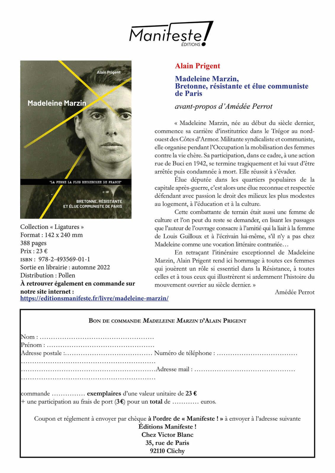 Biographie de Madeleine Marzin (1908-1998) par Alain Prigent, historien, auteur et co-auteur de plusieurs livres sur les parcours de militants du parti communiste, la résistance ). Bretonne, Madeleine Marzin fut résistante et élue communiste de Paris. Son frère Francis a également été un résistant et militant communiste de la région de Carhaix, dans le Finistère.