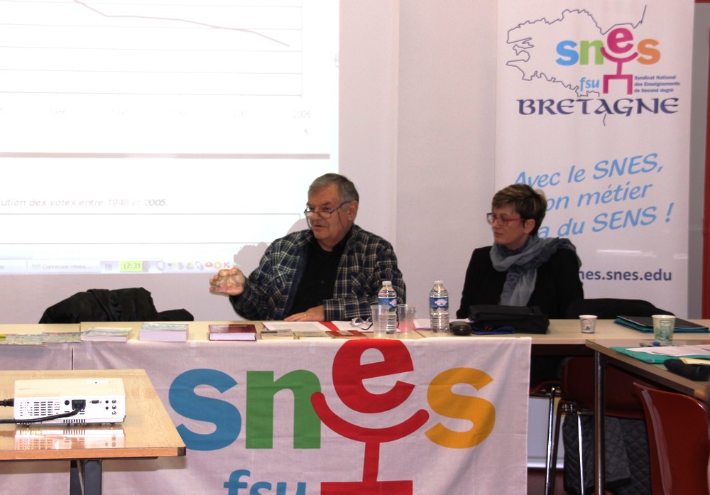 D’abord l’éclairage très utile de l’historien, Alain Dalançon, agrégé et président-fondateur en 1985 de l’Institut de recherches sur l’histoire du syndicalisme dans le second degré. Il a retracé les différentes phases de l’histoire de notre syndicalisme en prenant pour fil rouge la question de la représentativité, mesurable à travers la syndicalisation et les élections professionnelles. Car le SNES a toujours tiré une grande part de son efficacité de sa représentativité. Il est aujourd’hui de plus en plus touché par la diminution de la syndicalisation et il vient de connaître une baisse aux élections professionnelles de décembre. Il a déjà connu des reculs de sa représentativité, en 1969 et 1984 par exemple, mais a réussi à rebondir.